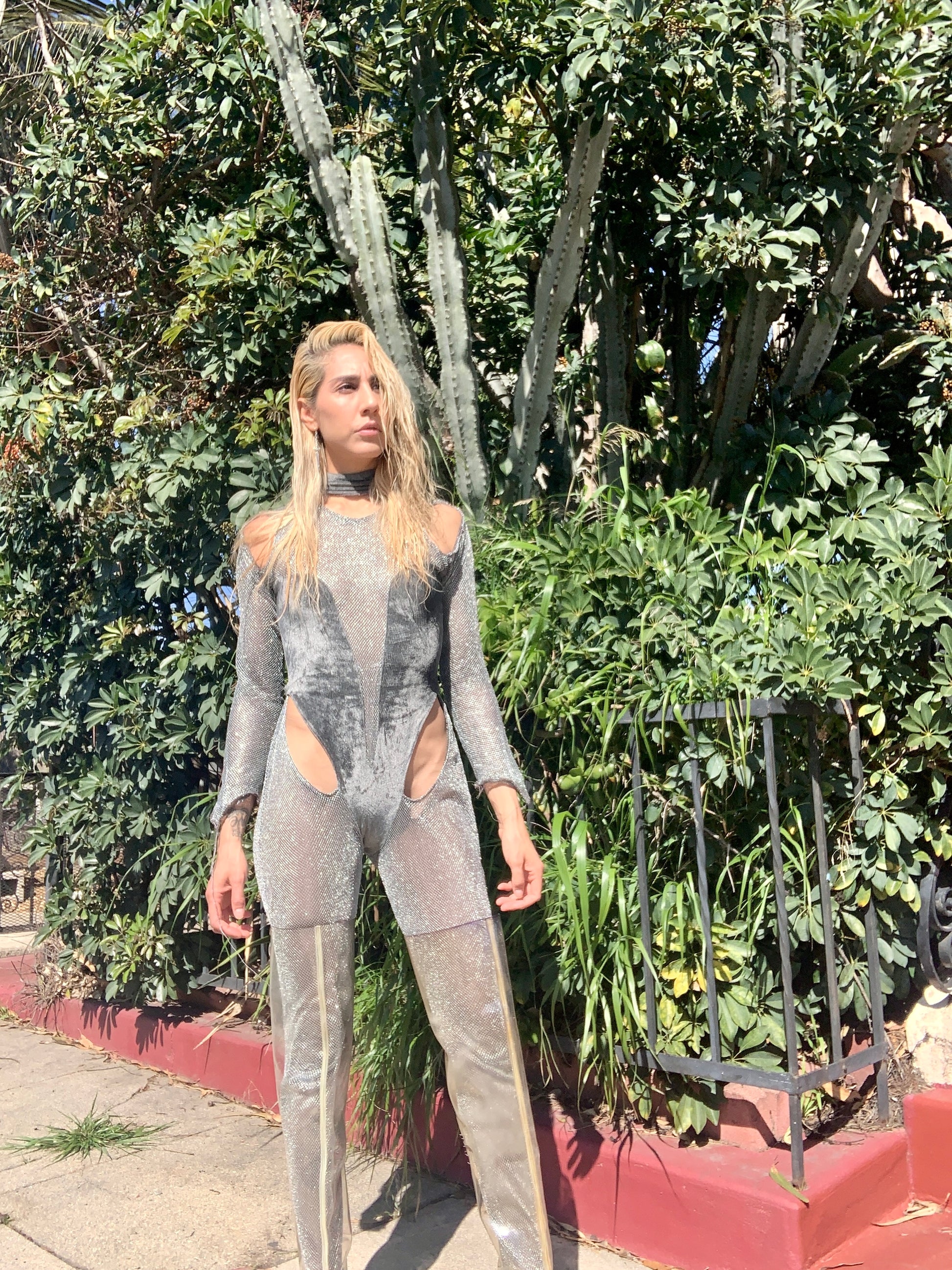 A contrast of velvet and sheer with silver net overlay. Custom only.